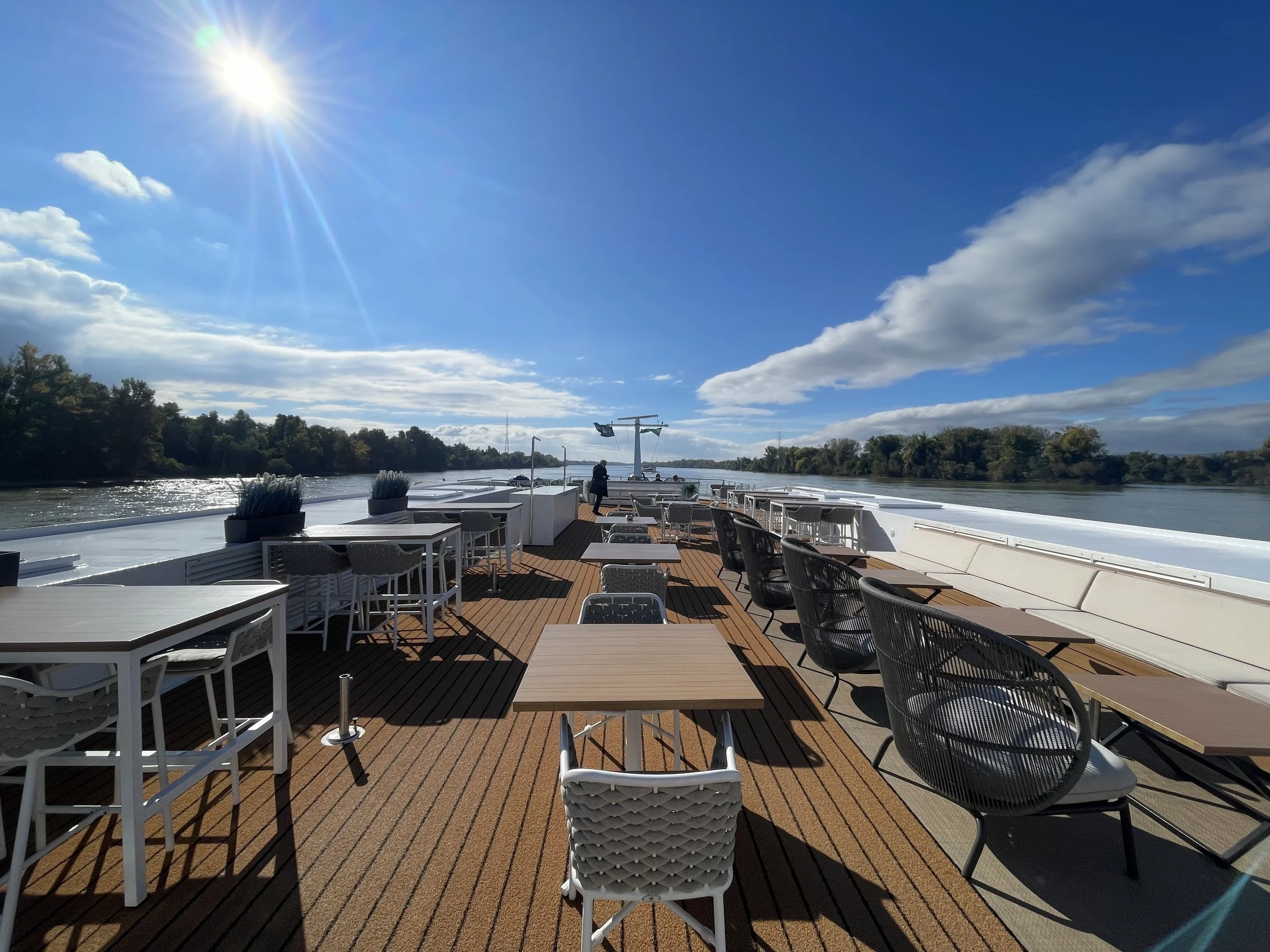 Spannender Fakt: die Amadeus Riva ist gemäss den Ausführungen des Kapitäns ein 2,5er Schiff. Das bedeutet, dass die Decks der Riva stufenweise gebaut worden sind. Dies erlaubt es dem Schiff das vordere Sonnendeck immer geöffnet zu lassen, auch wenn an einem Flusstag mehrere Brücken passiert werden. Auf der Mosel, Saar oder auch auf der Donau ist das nämlich der Fall und herrkömmliche Flusskreuzfahrtschiffe müssen dann das gesamte Sonnendeck sperren. Nicht aber auf der Amadeus Riva!