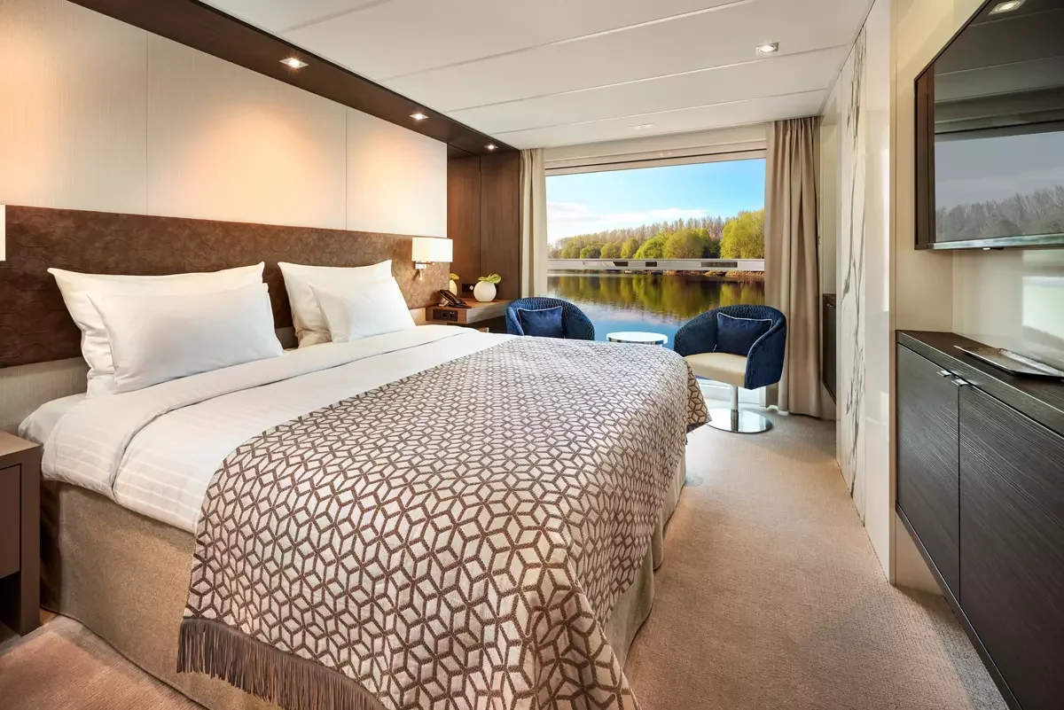Auf der Amadeus Riva habt ihr eine grosse Auswahl an Kabinen und Suiten. Die preiswertesten Kabinen befinden sich auf dem Hauptdeck (Haydn-Deck). Die Aussenkabinen bietet mit 16 Quadratmeter genügend Platz für zwei Personen und kommen mit einem begehbaren Kleiderschrank sowie einem grosszügigen Badezimmer.