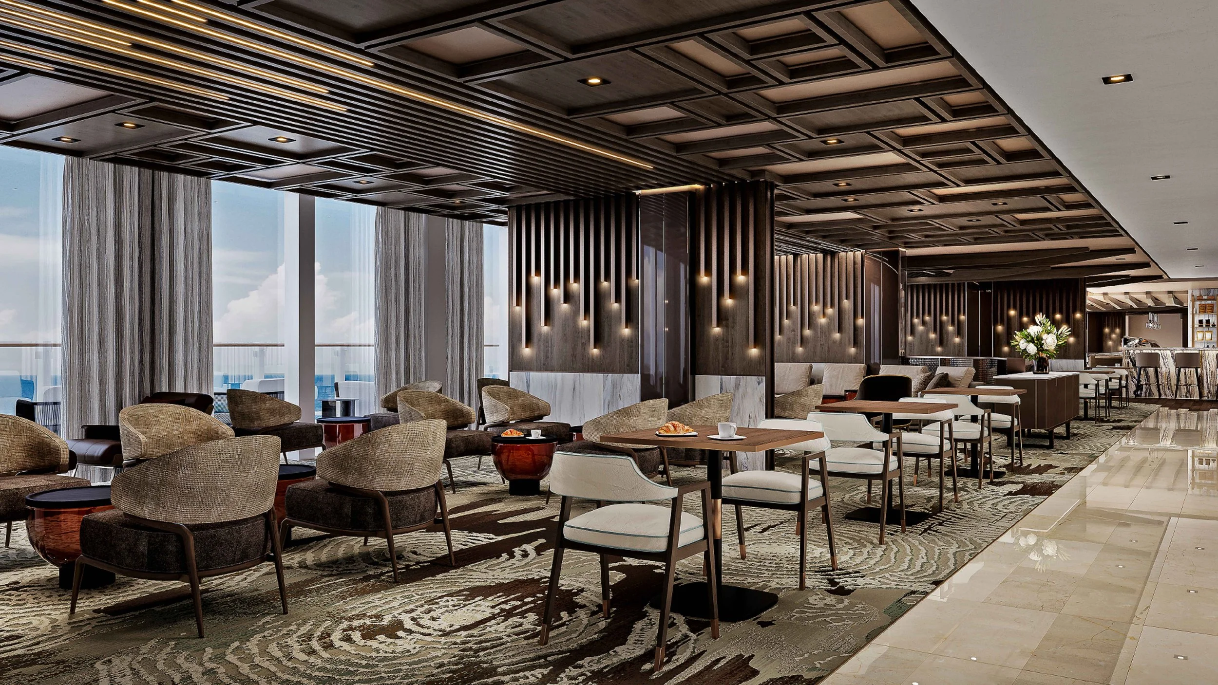 Für die EXPLORA III als skulpturales, doppelstöckiges Atrium neu gedacht, wirkt die Lobby zugleich beeindruckend großzügig und angenehm persönlich. Sie ist geprägt von fließenden Kurven, strukturierten Oberflächen und stärkeren Kontrasten aus „Perlato di Sicilia“- und „Sahara Noir“-Marmor. Kaskadierende „Venini“-Lüster erinnern an Gischt über der neuen asymmetrischen Treppe, die in einer eleganten Kurve zur organisch geformten, kreisförmigen Bar führt. Weiche Linien und einladende Sitzlandschaften schaffen intime Bereiche, ergänzt um ausgewählte Stücke von „Paolo Castelli“ und „Molteni“, die eine echte Lounge-Atmosphäre erzeugen, ideal vom Tee-Service bis zu privaten Treffen vor und nach dem Dinner. Ein Kamin verstärkt die kommunikative Energie des Raums, ergänzt durch zeitgenössische Kunstwerke von „Yves Dana“ und „Nena“, sanfte Beleuchtung und eine eigene Musik-Ecke mit einem „Steinway“-Piano. Von der Morgenpause über Aperitifs bis zu späten Cocktails mit Live-Musik dient die Lobby Bar als eleganter sozialer Treffpunkt im Zentrum des Lebens an Bord der EXPLORA III.